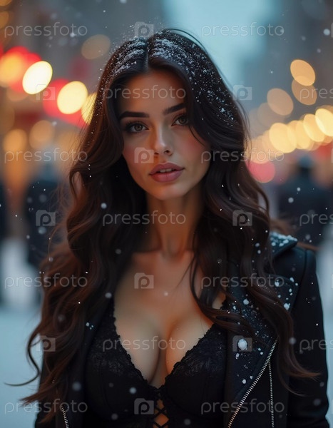Потрясающая женщина смотрит мягко, когда вокруг нее падают снежинки в восхитительной городской обстановке, захватывая магию рождественского сезона