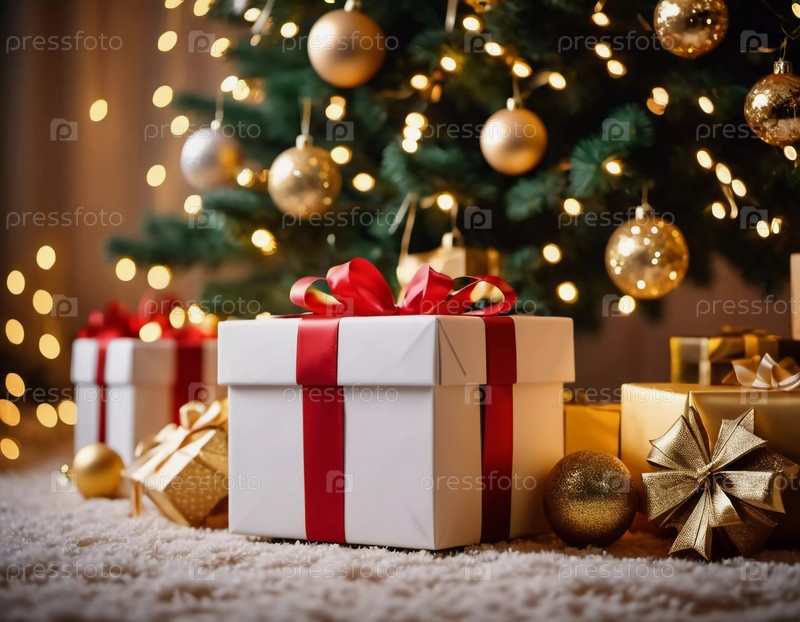 Празднично упакованные подарки в окружении красочных рождественских шаров под красиво украшенной пихтой во время радостного новогоднего сезона