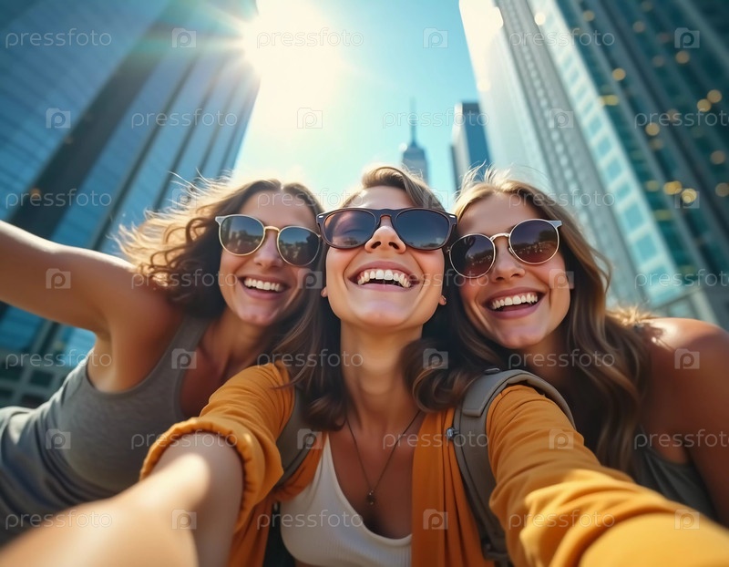 Трое друзей разделяют смех и улыбки, делая селфи перед высокими небоскребами.Они греются на солнце, излучая чистую радость и дружбу в оживленном городском пейзаже