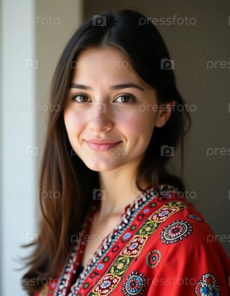 Веселая азиатская женщина демонстрирует свою теплую улыбку, одетая в красочный традиционный наряд, излучая радость в хорошо освещенном помещении в полдень