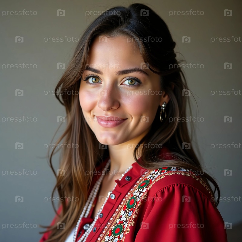 Молодая белорусская женщина излучает очарование и грацию, нося ярко-красную блузку с традиционными вышивками
