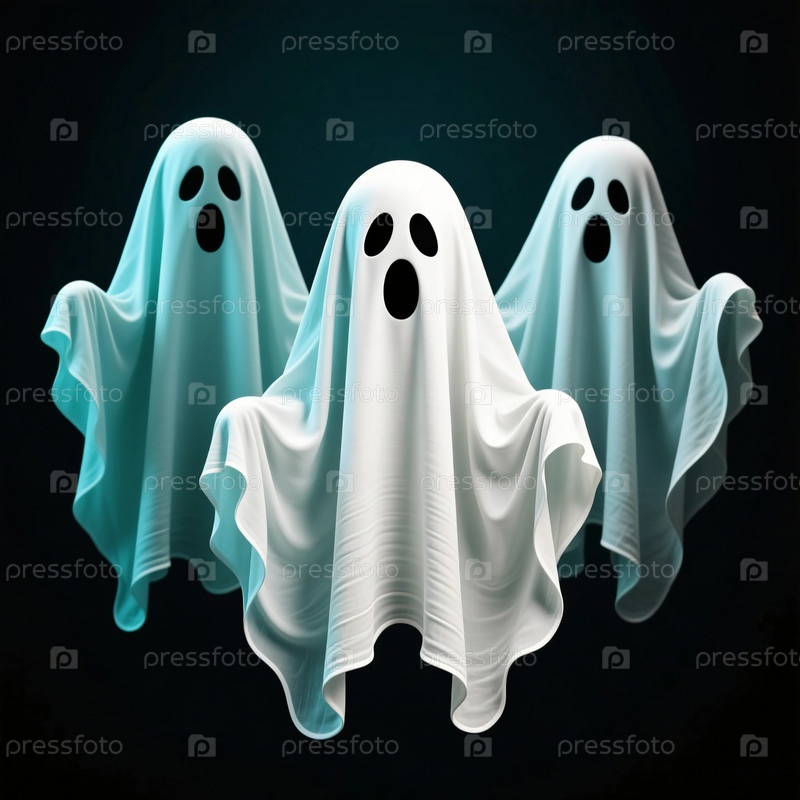 Три призрачных фигуры с белыми простынями плавают в темной обстановке, захватывая дух Хэллоуина