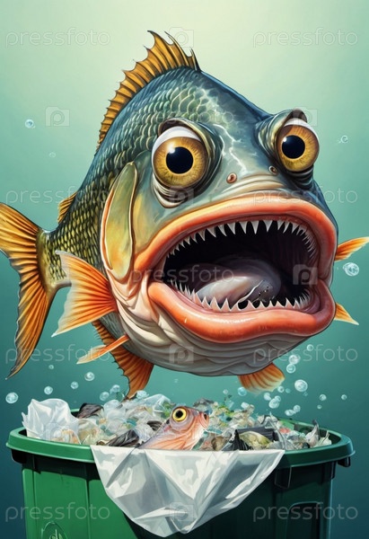 Большая рыба с преувеличенными выпуклыми глазами реагирует в ужасе, когда плывет по загрязненному району, заполненному отброшенным мусором, демонстрируя последствия загрязнения воды