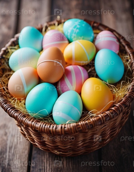 Пасхальные яйца различных цветов отдыхают в корзине, создавая праздничную атмосферу.Устроенные для весеннего торжества на открытом воздухе, яйца добавляют цвет и радость, символизируя обновление и единство во время праздника
