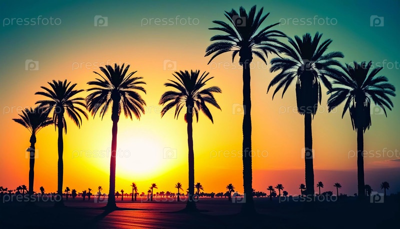 Золотые лучи солнечного света купаются на горизонте, когда пальмы стоят высоко и бросают длинные тени на землю.Этот спокойный вечер вызывает расслабление и красоту Generative AI
