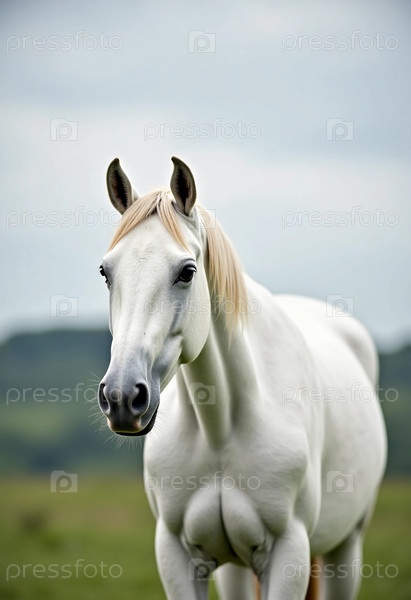 С его ярким белым пальцем, блестящим мягко, изящная лошадь стоит на живом зеленом поле в окружении нежных холмов, воплощая спокойствие и элегантность по мере приближения сумерек