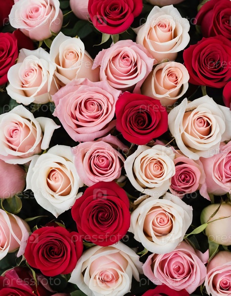 Красочные розы в различных тонах красного, розового и белого цвета создают потрясающий дисплей, подчеркивая красоту природы и символизируя любовь в очаровательном цветочном аранжировке