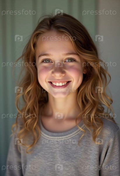 Молодая белая девушка с красивыми глазами и волнистыми волосами стоит, мягко улыбаясь.Ее игривое поведение просветляется, когда она позирует в уютном помещении во Франции.Генеративный ИИ