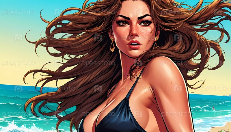Женщина наслаждается оживленным днем на пляже, бегая вдоль береговой линии в купальнике, ее длинные волосы свободно текут в океаническом бризе, а волны мягко обнимают ее ноги