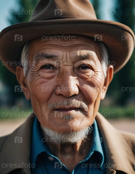 75-летний пожилой джентльмен тепло смотрит в камеру, демонстрируя линии хорошо прожитой жизни.Он одет в шляпу и пальто на размытом фоне днем.Генеративный ИИ