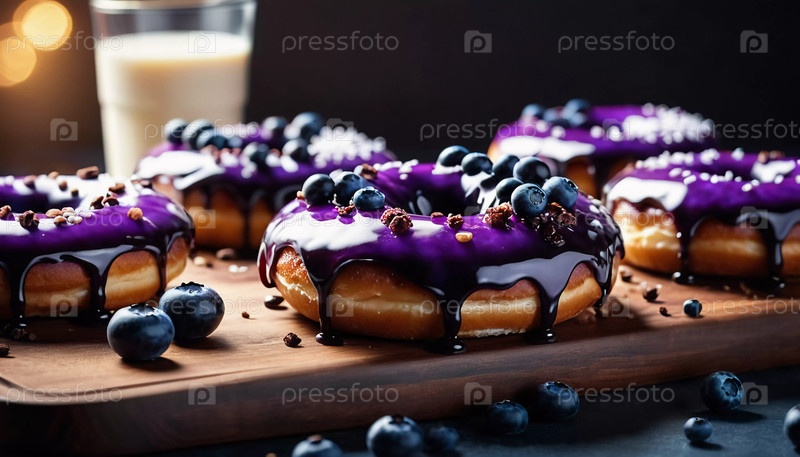 Соблазнительная куча свежеприготовленных голубиных филевых пончиков с богатой глазурью, демонстрирующих яркие ягоды сверху, идеально подходит для желания десерта в любое время суток