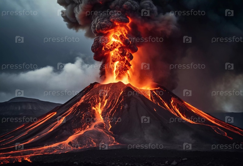 Под драматическим сумеречным небом вулкан извергается, выбрасывая в воздух расплавленную магму. горячая лава течет по ее крутым склонам, освещая окрестности огненным светом