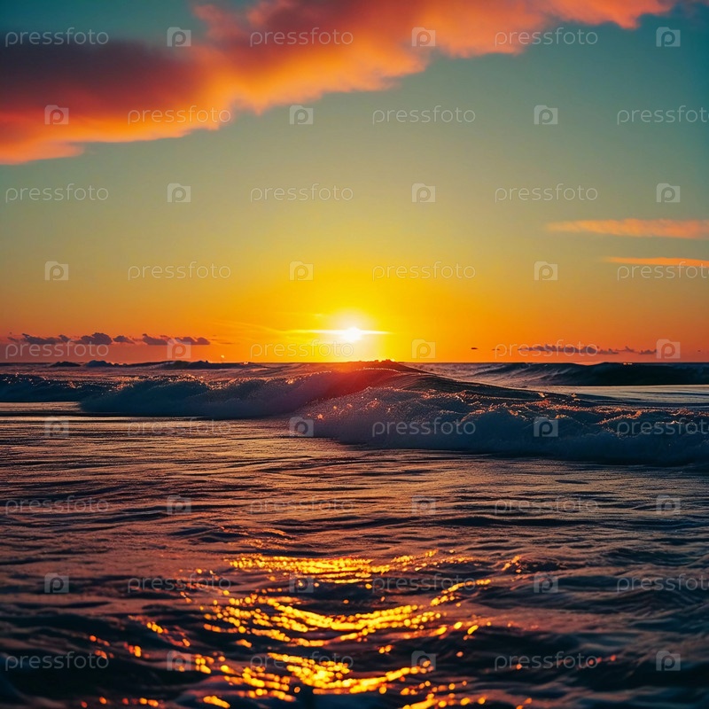 Горизонт светит яркими оранжевыми и красными цветами, поскольку волны мягко врезаются в берег, отражая теплые цвета заходящего солнца на спокойной поверхности океана