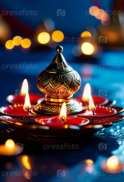 Цветные лампы дия светят мягко в темном пространстве, создавая мирную атмосферу.Этот красивый дисплей символизирует празднование Дивали и Рамадана, объединяющие культуры.Генеративный ИИ