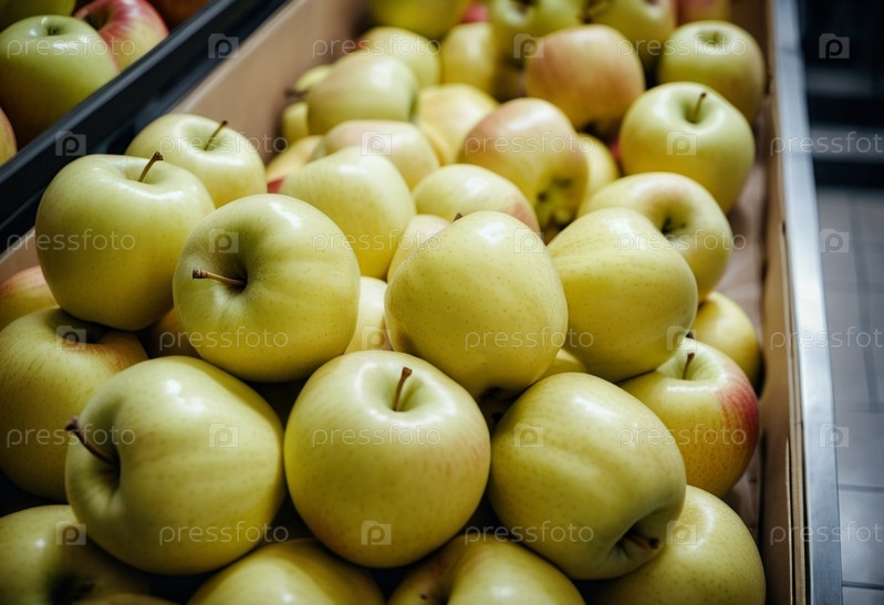 Красочный ассортимент желтых яблок аккуратно расположен на стойке супермаркета, приглашая клиентов исследовать и выбирать свежие фрукты