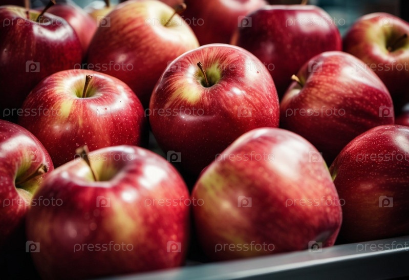 Красочный ассортимент красных яблок аккуратно расположен на прилавке супермаркета, приглашая клиентов исследовать и выбрать свежие фрукты