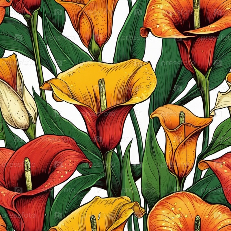 Ярко окрашенные калла-лилии заполняют холст среди пышных зеленых листьев на ярком фоне, создавая привлекательный цветочный дисплей