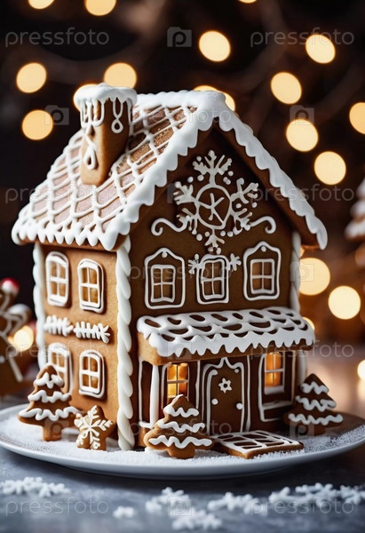На тарелке выделяется праздничный дом из пряников, украшенный мороженым, конфетами и снежными декорациями.Он отражает дух рождественской выпечки, окруженной веселой атмосферой.Генеративный ИИ