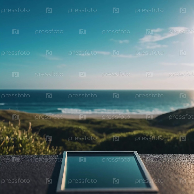 Таблетка сидит на обочине с потрясающим видом на пляж и океан.Солнце садится, излучая теплое свечение над водой и холмами, создавая мирную атмосферу.Генеративный ИИ