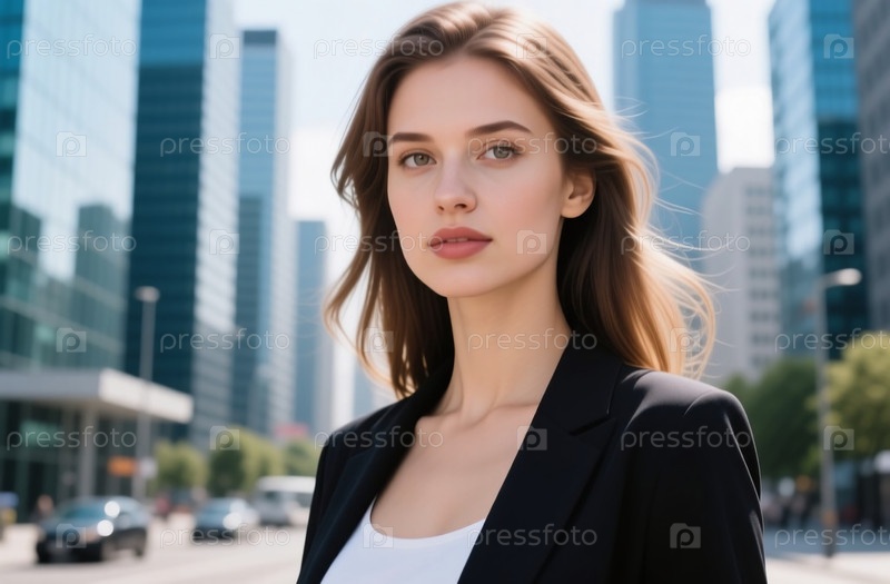 Яркий солнечный свет подчеркивает уверенную женщину в формальной одежде, которая гуляет по современному городскому ландшафту