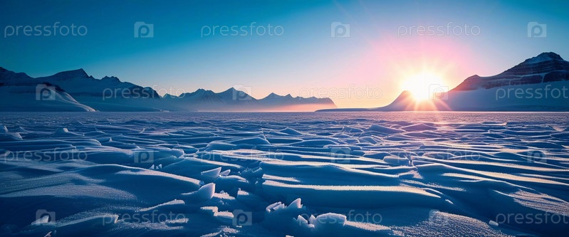 Спокойный арктический ландшафт тундры покрыт морозом при восходе солнца, излучая золотистый свет над ледяной местностью и освещая тонкие образования льда