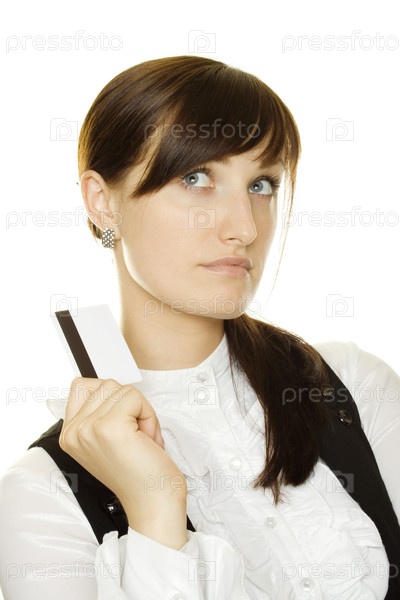 Портрет бизнес-леди с пластиковой карточкой в руке