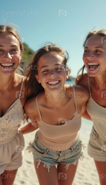 Друзья наслаждаются солнечным днем на пляже, улыбаясь и смеясь во время совместного запечатления веселого момента. Голубое небо дополняет их радостный дух и летнюю атмосферу. Белый песок. Генеративная ИИ