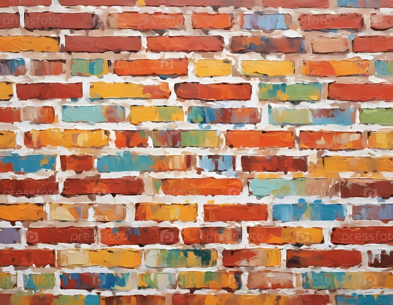 Текстурированная кирпичная стена отображает множество цветов, включая теплые красные, оранжевые и прохладный синий цвета, добавляя яркость и глубину современному пространству