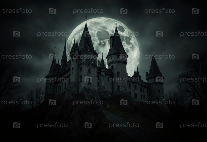 Вампирский замок зловещим образом стоит на ночном небе, освещенный большой светящейся полнолунией, создавая идеальную атмосферу Хэллоуина