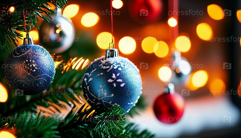 Красочные рождественские украшения украшают ветви пихты, яркие шары в оттенках синего, воплощающие праздничное настроение зимой