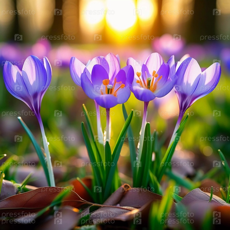 Нежные розовые цветы крокуса расцветают в пышной зеленой траве, солнечный свет в тихой весенней обстановке. Возрождение природы. Шафран Крокус - род многолетних луковичных травных растений семейства Ирис Iridaceae