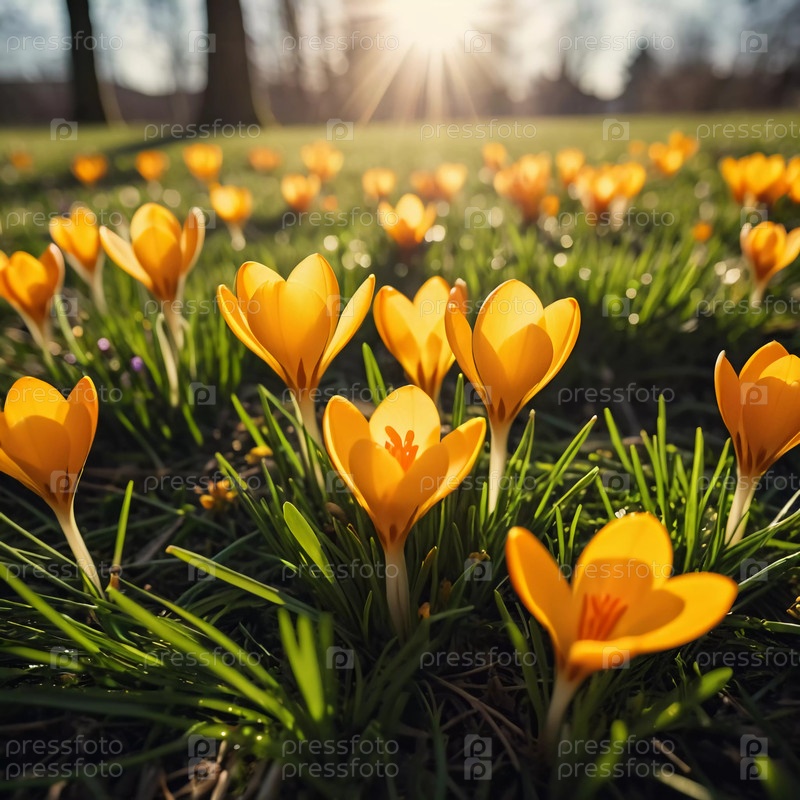 Нежные желтые цветы крокуса расцветают в пышной зеленой траве, солнечный свет в тихой весенней обстановке Возрождение природы Шафран Крокус - род многолетних луковичных травных растений семейства Iris Iridaceae