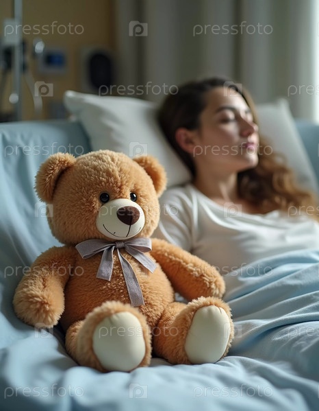 В спокойной больничной комнате запечатлена молодая женщина, лежащая в постели и отдыхающая с закрытыми глазами. Рядом с ней мягкий плюшевый медведь символизирует утешение и надежду во время ее сложного пути выздоровления