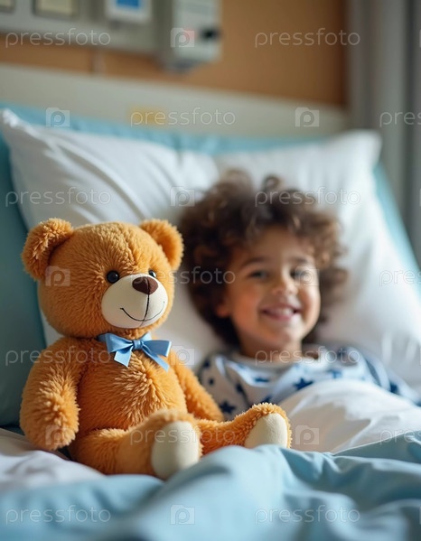 Яркие улыбки освещают больничную комнату, когда ребенок сидит в постели, поддерживается подушками и теплым плюшевым медведем.Вместе они разделяют надежду и утешение во время выздоровления