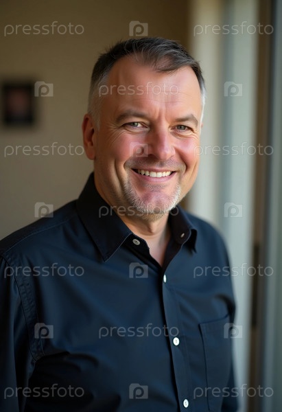 Белорусский мужчина в возрасте около 40 лет стоит с дружественной улыбкой, одетый в черную рубашку.Теплая атмосфера добавляет к его доступному поведению и захватывает момент счастья