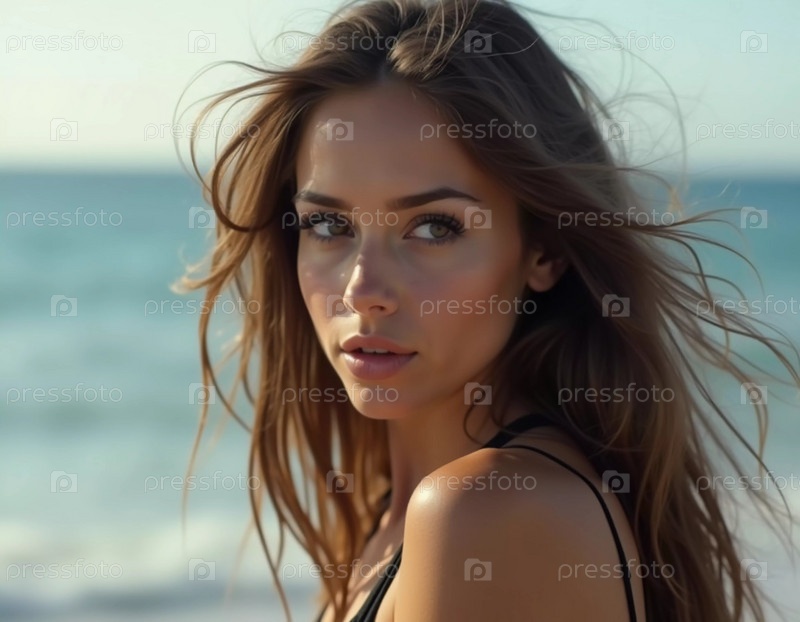 Брюнетка в купальнике смотрит назад, стоя возле береговой линии. Нежные морские волны обнимают ее у ног под чистым голубым небом. Длинные волосы, красивое молодое лицо. Путешествия и реклама одежды