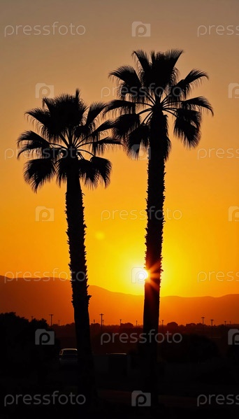 По мере того, как день темнеет, две высокие пальмы величественно стоят на горизонте, освещенные захватывающим вздохом захода солнца.Небо вспыхивает теплыми яркими цветами Generative AI