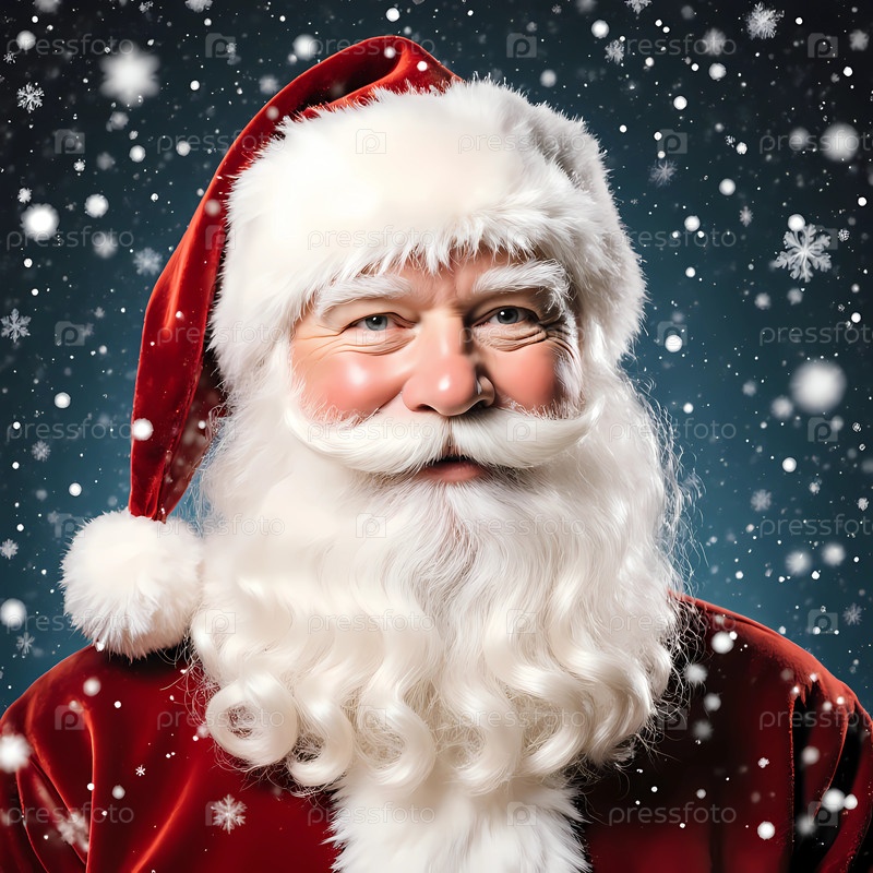 Санта-Клаус позирует с дружественной улыбкой, когда вокруг него падают снежинки.Он носит традиционный красный костюм и шляпу.Эта сцена отражает дух праздничного сезона Generative AI