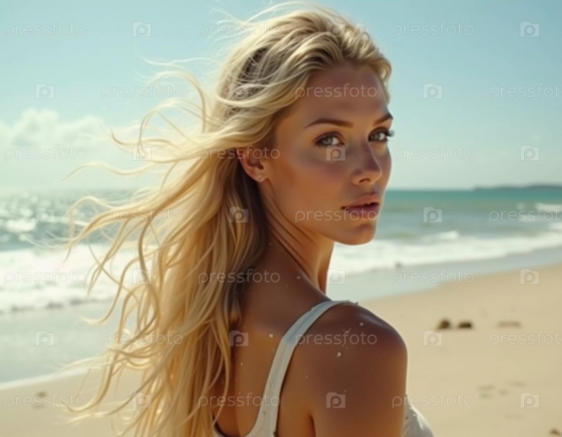 Блондинка в купальнике оглядывается назад, стоя рядом с береговой линией.Нежные морские волны обнимают ее у ног под чистым голубым небом.Длинные волосы, красивое молодое лицо.Путешествия и реклама одежды. AI