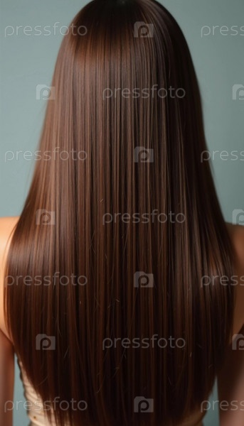 Гладкие, прямые коричневые волосы элегантно протекают вниз по спине, подчеркивая его здоровый блеск и равномерный цвет, освещенные мягким освещением, создавая поразительный вид