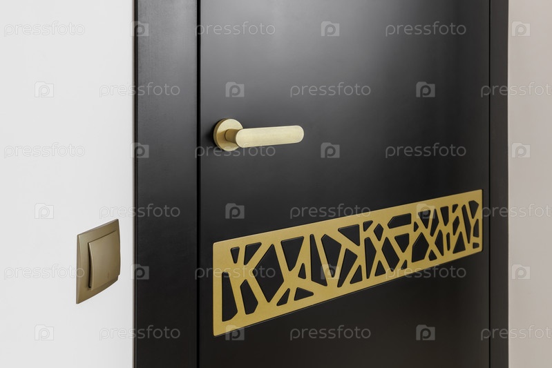 Роскошные черные детали дверей с атласной латунистой ручкой и декоративным золотым геометрическим вкладом. Высококачественное архитектурное оборудование для премиального дизайна интерьера и современной жилой недвижимости. Минималистский стиль с акцентом н