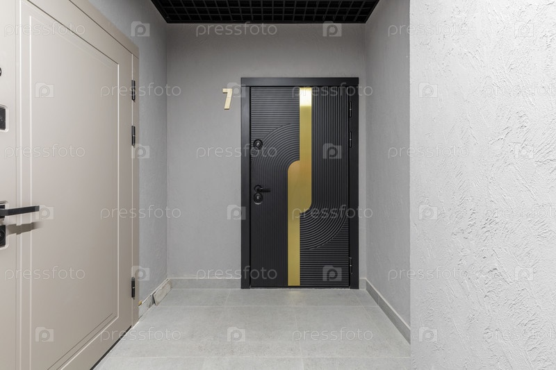 Изысканный коридор с высококачественной черной бронированной дверью, украшенной элегантной золотой инкрустацией и геометрическими узорами. Элитный дизайн входной зоны для элитной недвижимости и современных городских апартаментов. Профессиональный минимали