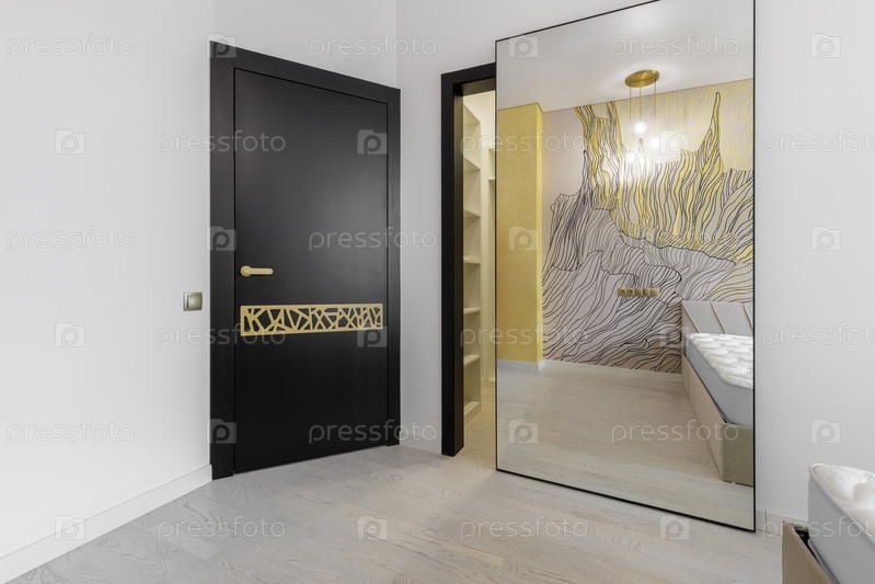 Современное фойе спальни с минималистской черной дверью со золотой геометрической инкрустацией и большим безрамным напольным зеркалом, отражающим стильную кровать и художественный декор стен