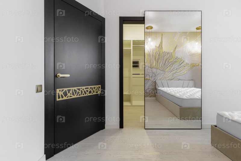Изысканный интерьер спальни с большой раздвижной зеркальной дверью со скрытым механизмом и дизайнерской черной дверью с золотой инкрустацией. Современный дизайн жилого помещения с видом на гардеробную, мебелью премиум-класса и продуманными решениями для э