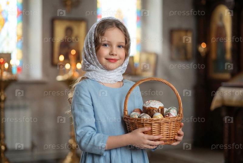 Религия и вера. Счастливой Пасхи. Портрет маленькой девочки в русском народном шарфе с плетеной корзиной пасхальных яиц и пасхального кулича внутри церкви