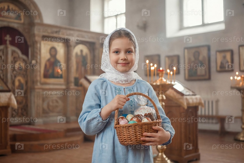 Религия и вера. Счастливой Пасхи. Портрет маленькой девочки в русском народном шарфе с плетеной корзиной пасхальных яиц и пасхального кулича внутри церкви