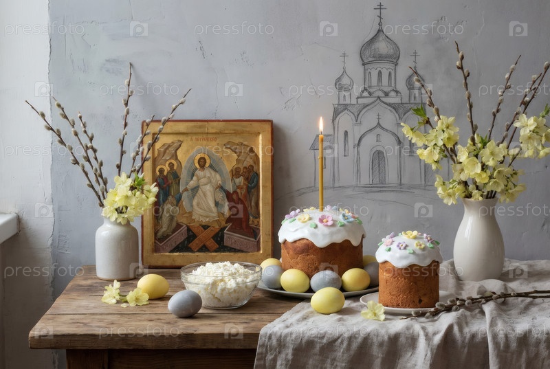 Пасхальные яйца, пасхальный торт, ива, цветы вишни и творог на серой стене с шаблоном храма.Концепция счастливой Пасхи 2026