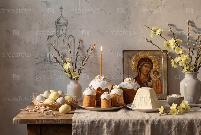 Пасхальные яйца, пасхальный торт, ива, цветы вишни и творог на серой стене с шаблоном храма.Концепция счастливой Пасхи 2026