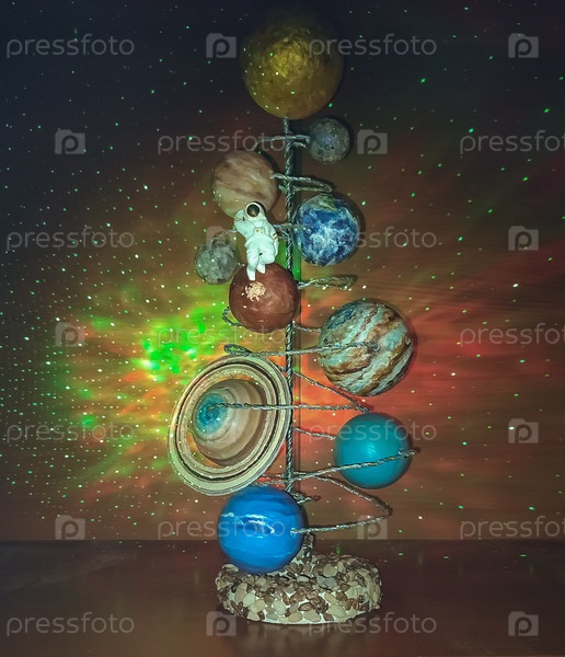 Самодельная модель Солнечной системы с астронавтом на фоне проекции звездного неба