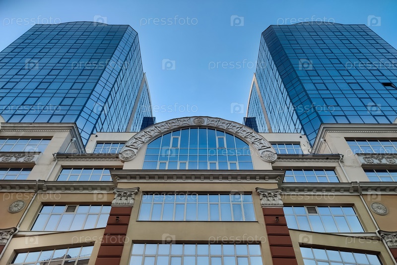 Фасад с классическими деталями и современными небоскребами на фоне чистого неба